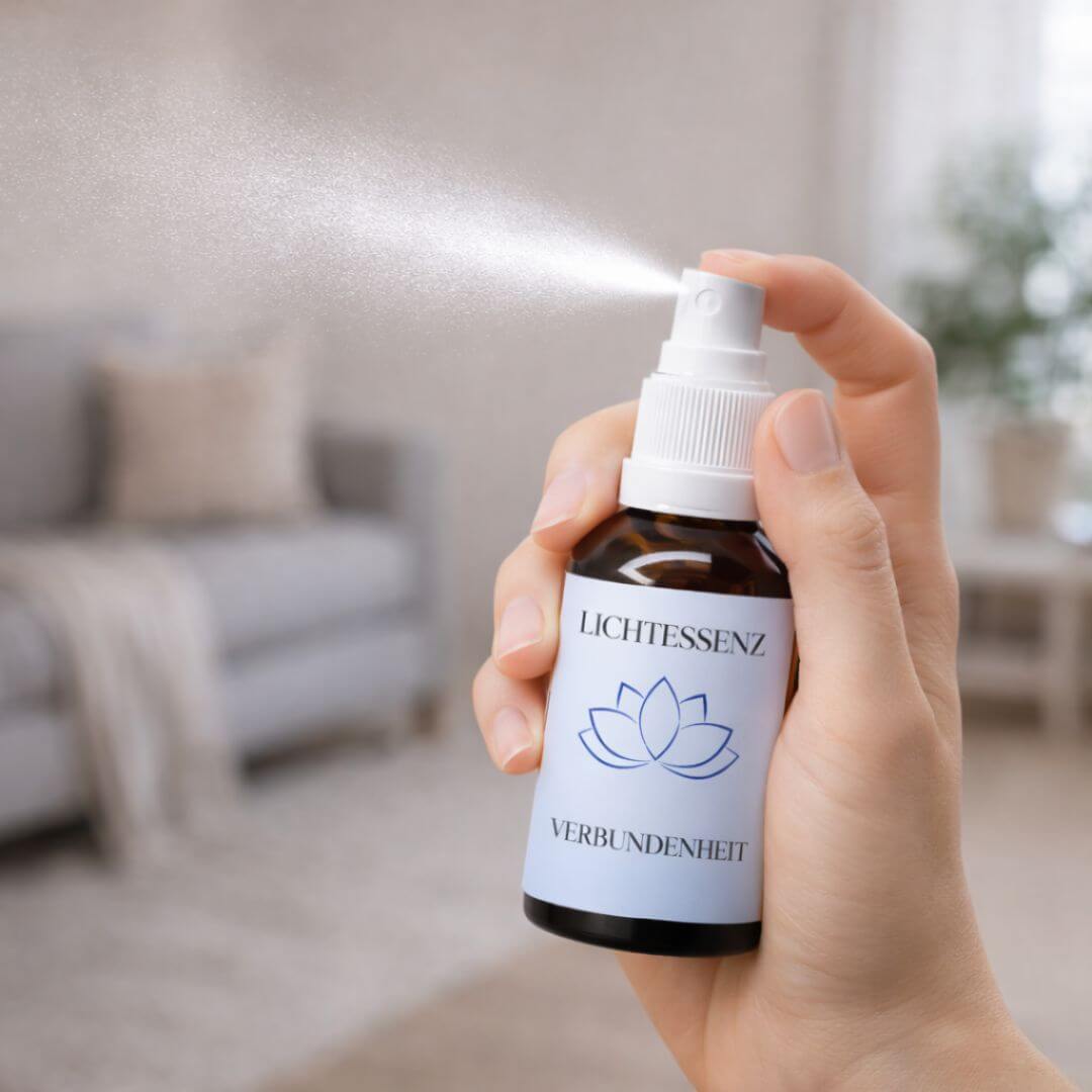 Je nach Raumgröße 2–5 Sprühstöße in die Aura und den Raum sprühen. Nicht auf die Haut sprühen.
